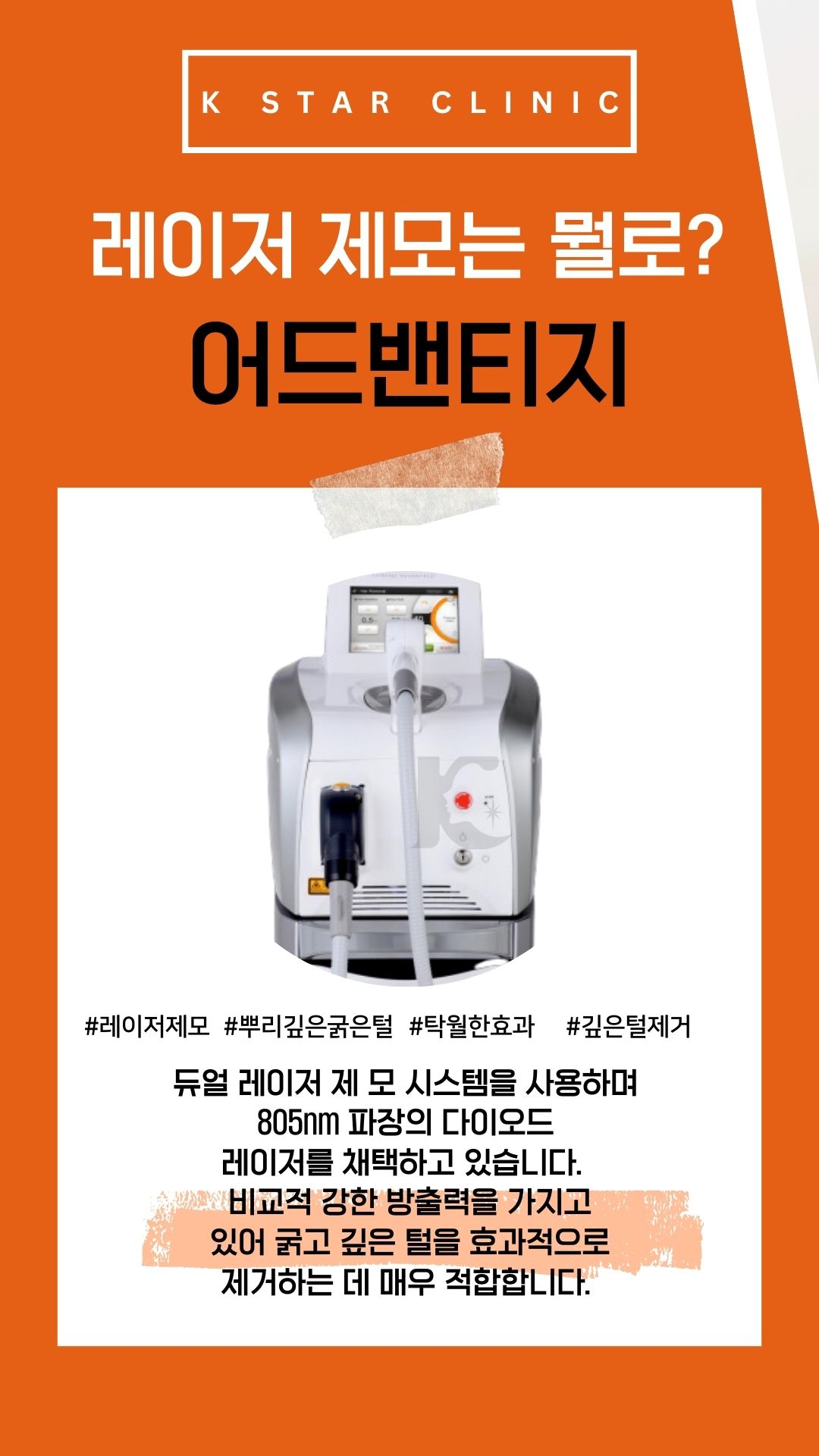 - 어드밴티지 레이저: 805nm 파장의 다이오드 레이저를 사용하여 굵고 깊은 털을 효과적으로 제거합니다. 강한 방출력을 가지고 있어 사용자가 핸드피스를 피부에 직접 접촉시켜 레이저를 조사하며, 쿨링 기능이 있어 피부를 보호합니다.