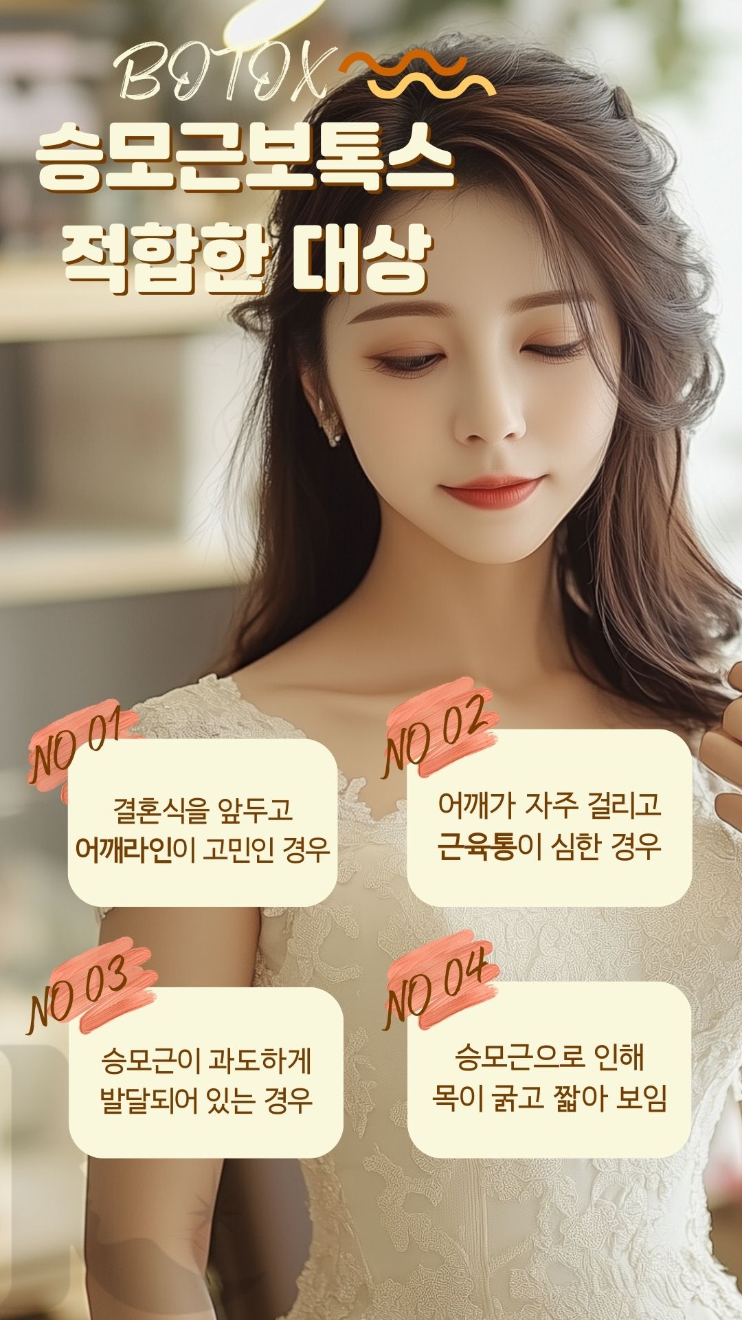 승모근 보톡스는 어깨와 목의 라인을 개선하거나 근육의 과도한 긴장을 완화하고자 할 때 유용합니다. 아래는 승모근 보톡스가 적합한 주요 대상입니다:
