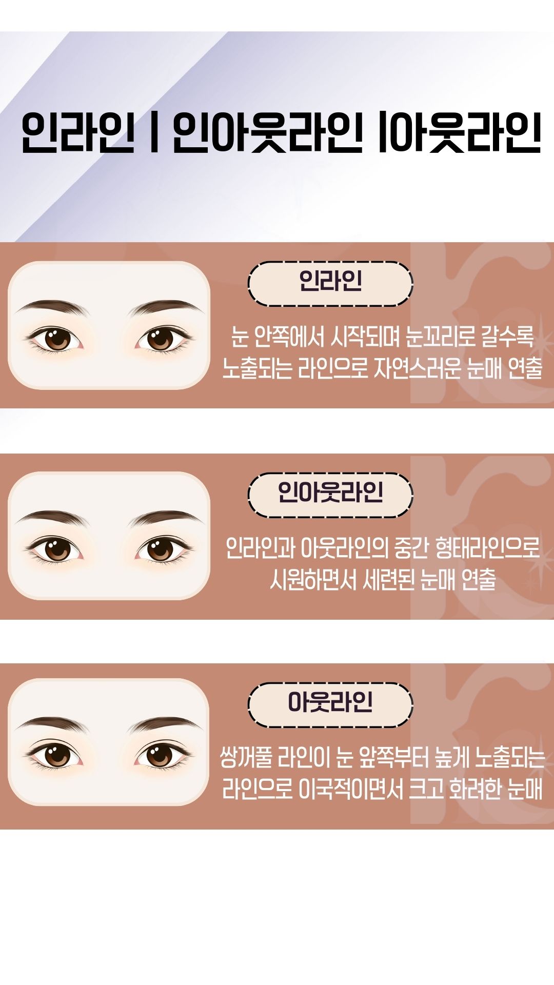 ✔ 쌍꺼풀 라인의 디자인 → 자연스러운 아웃라인, 또렷한 인아웃라인 등 개인의 인상과 어울리는 라인을 선택해야 합니다.