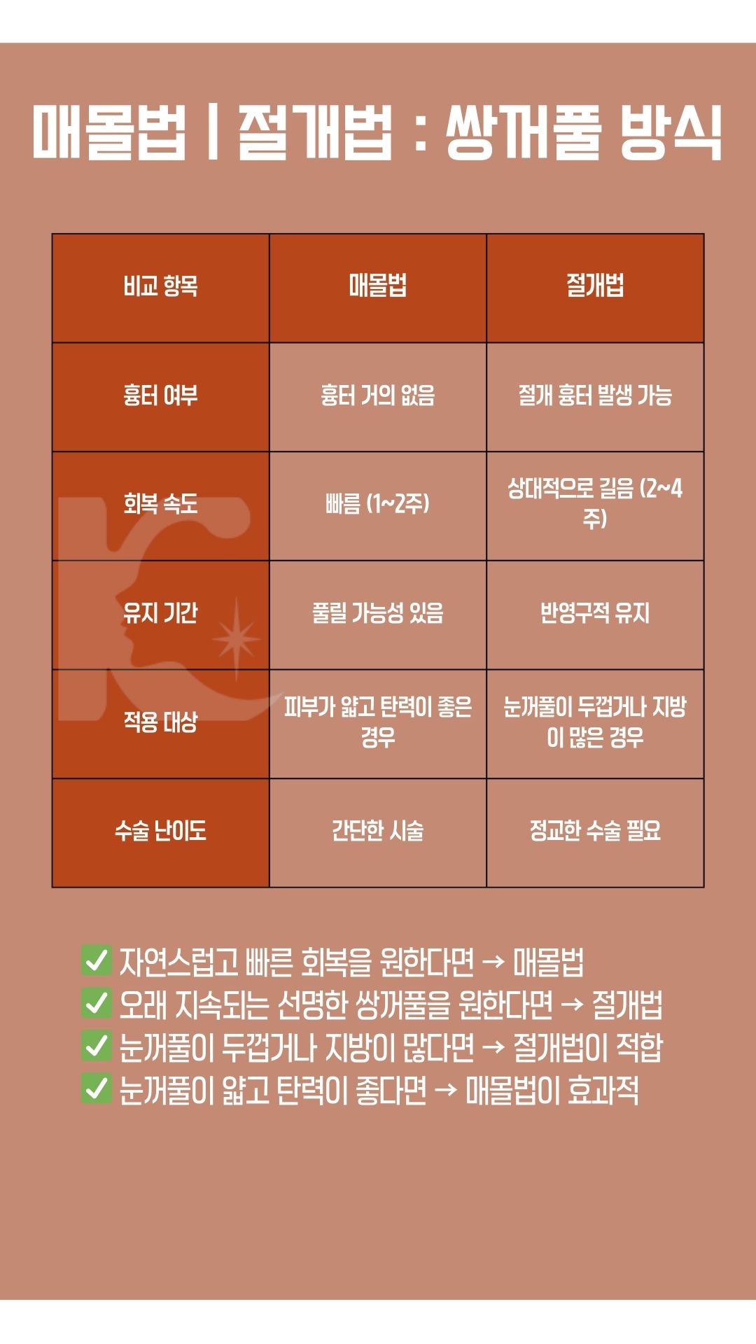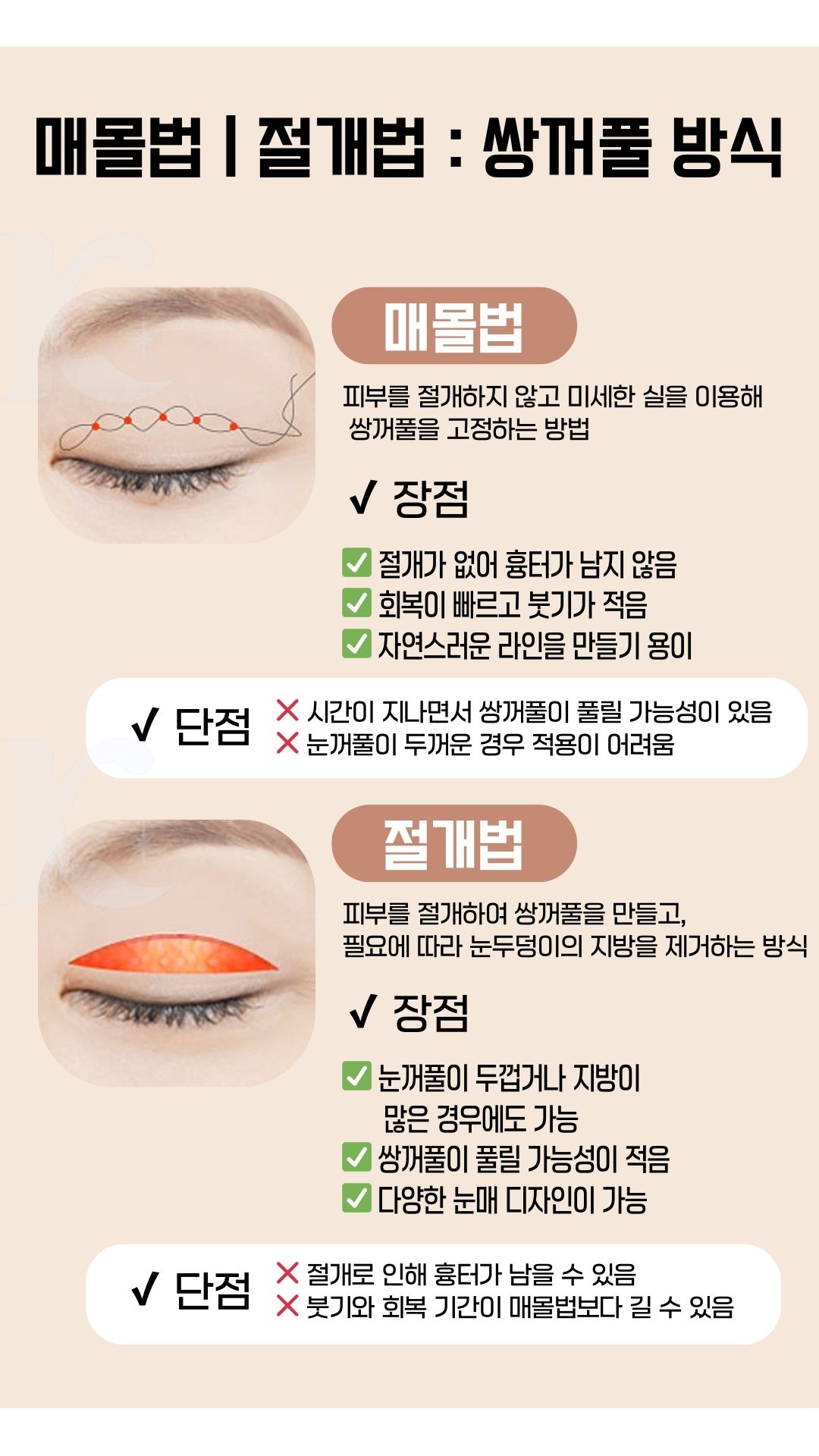 눈 형태와 피부 상태에 따라 적절한 수술 방법이 달라지므로, 본인의 눈 구조에 맞는 개선 방안을 선택하는 것이 중요합니다.