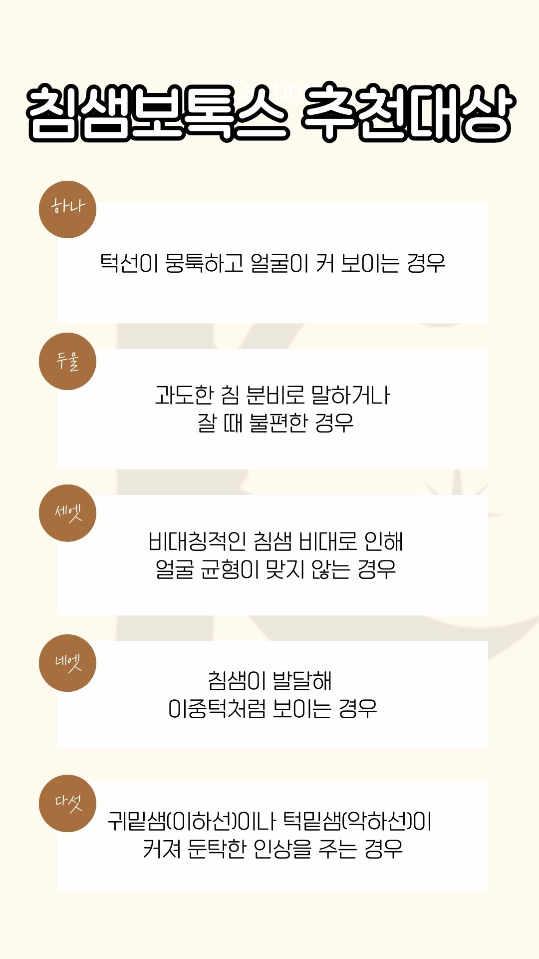 | 추천 대상 | 침샘이 발달하여 얼굴이 넓어 보이는 경우 | 씹는 근육이 커서 얼굴이 각져 보이는 경우 |