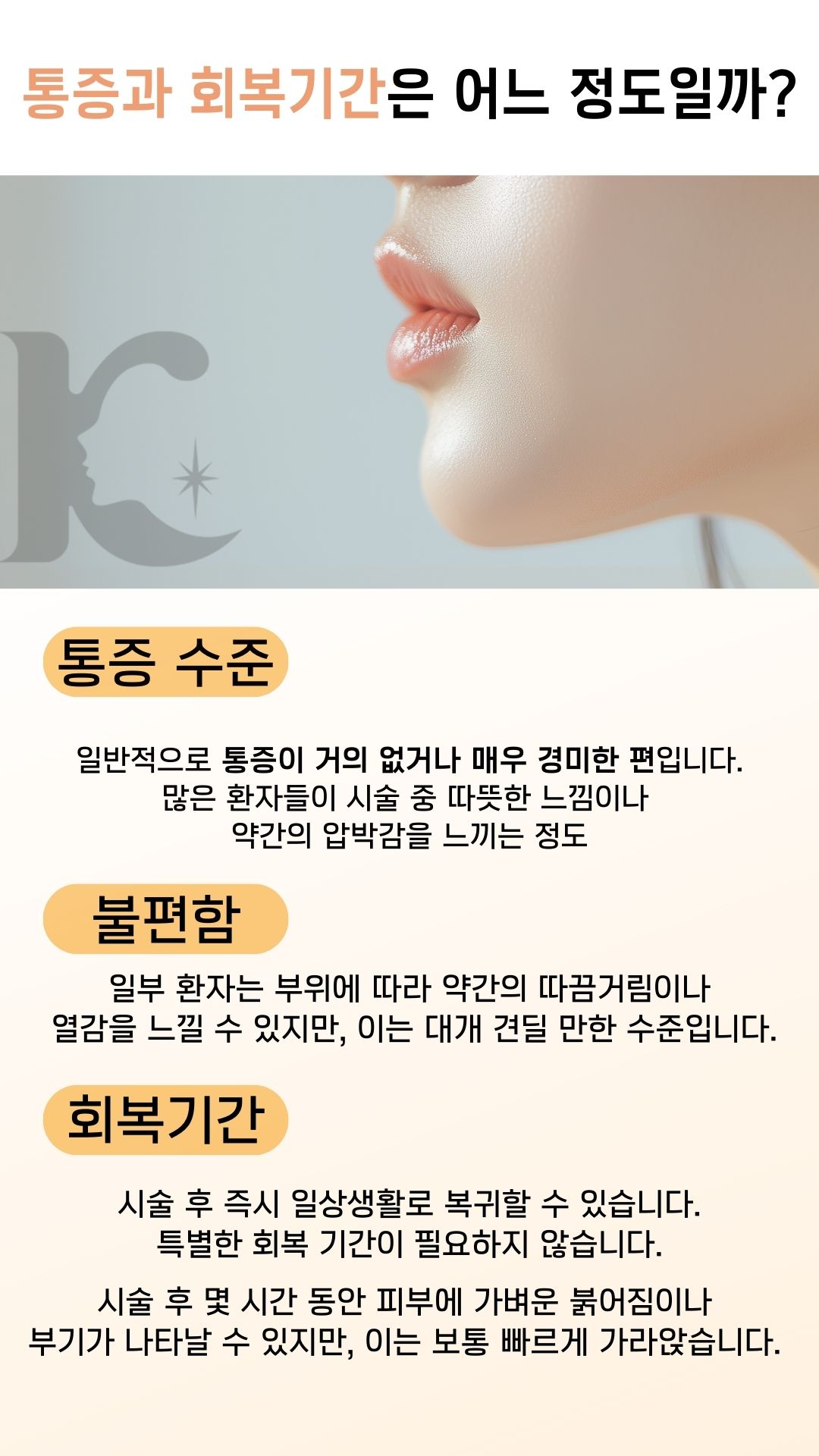 회복 기간은 짧습니다. 대부분의 환자들은 시술 후 바로 일상생활로 복귀할 수 있으며, 특별한 회복 기간이 필요하지 않습니다. 그러나 개인의 피부 상태나 시술 부위에 따라 다소 차이가 있을 수 있습니다.