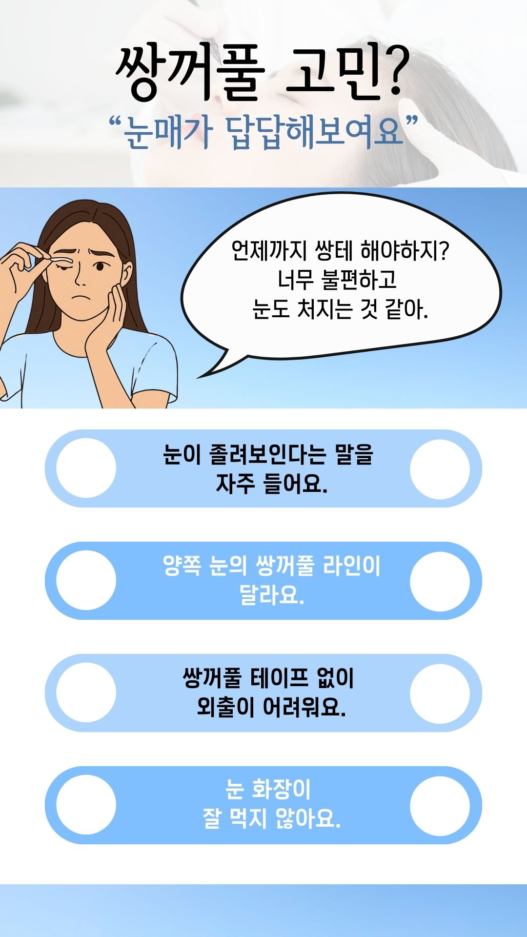 눈매의 기능성과 미용을 함께 조정하는 과정입니다.