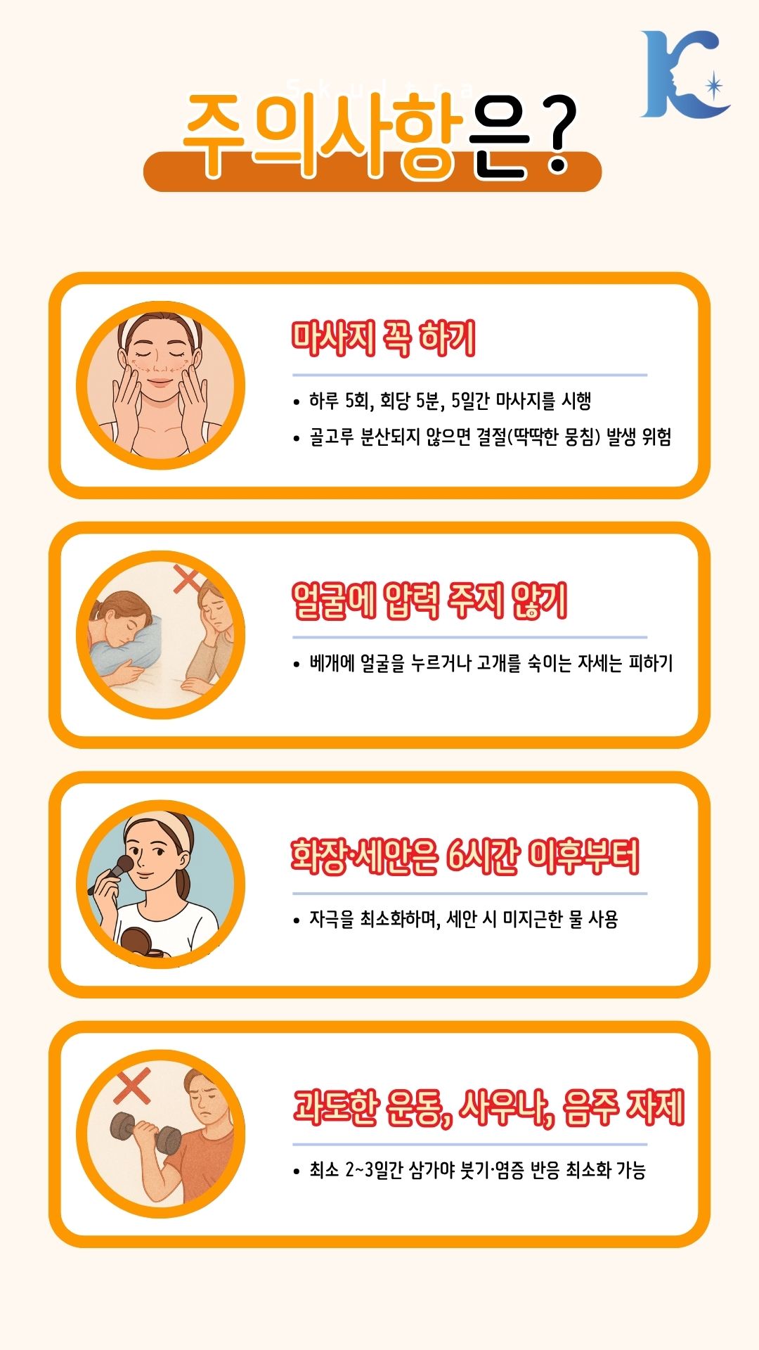 사우나, 뜨거운 찜질, 격한 운동, 음주는 며칠간 피합니다.