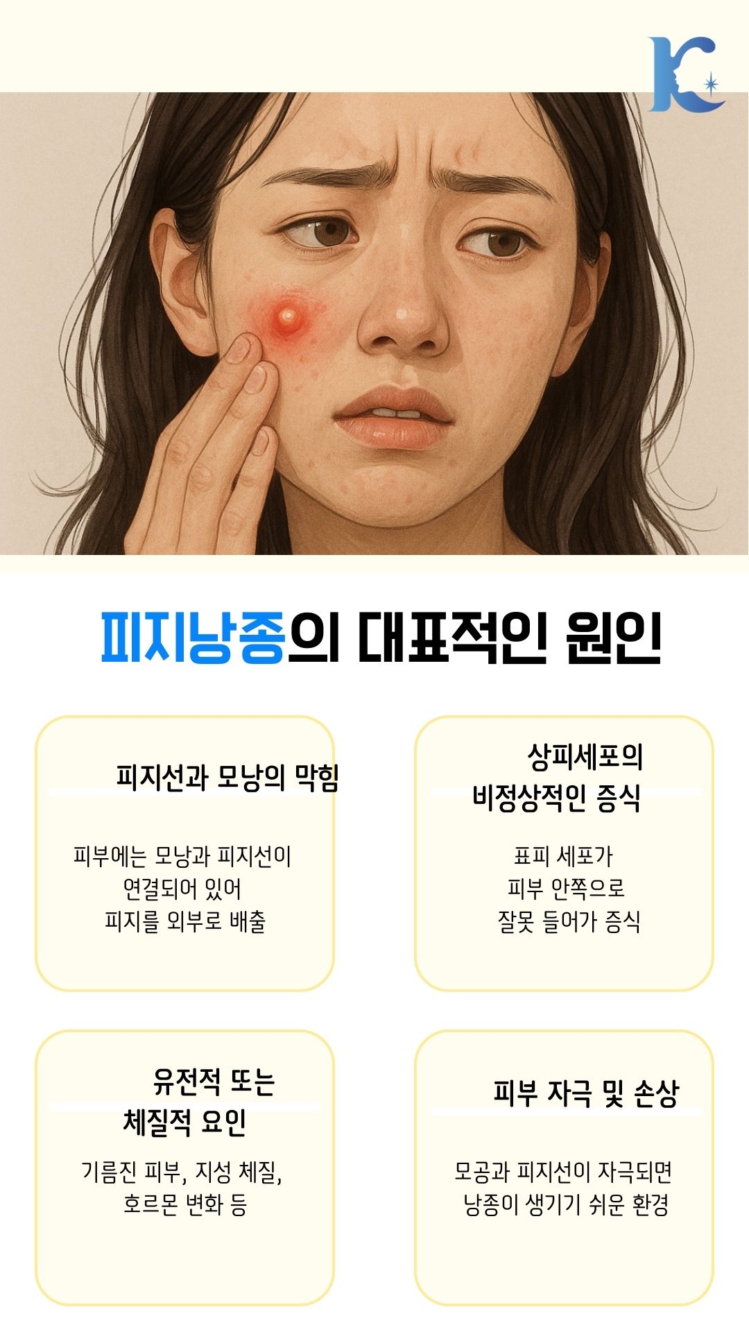 피지선의 통로가 막히면 피지가 빠져나가지 못하고 안쪽에 고여 낭이 형성.
